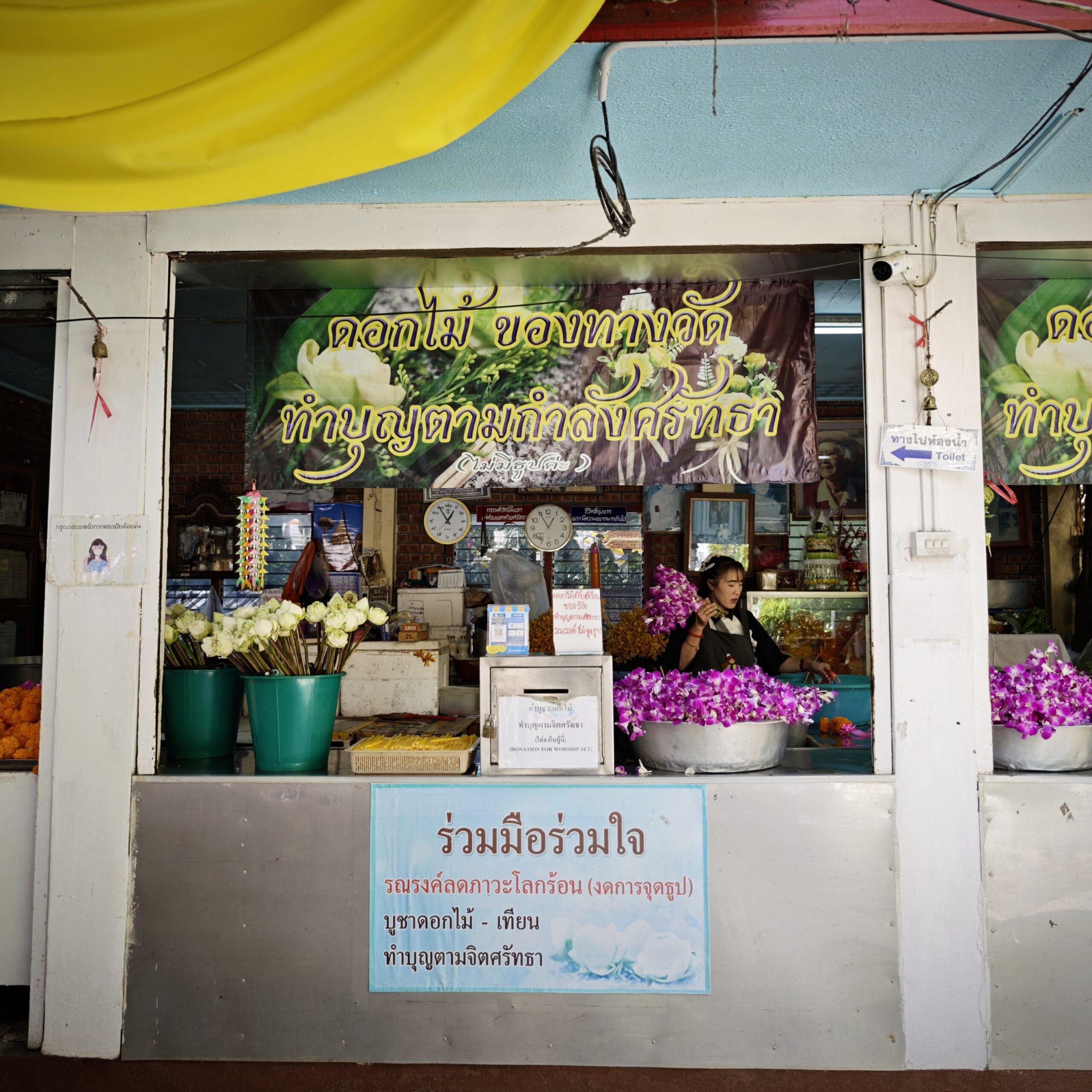 お供えの花は、20B(約90円)のタンブン(寄付)と引き換えに貰えますよ。場所は、ナーガ様の階段を登りきった門のすぐ右手側です。