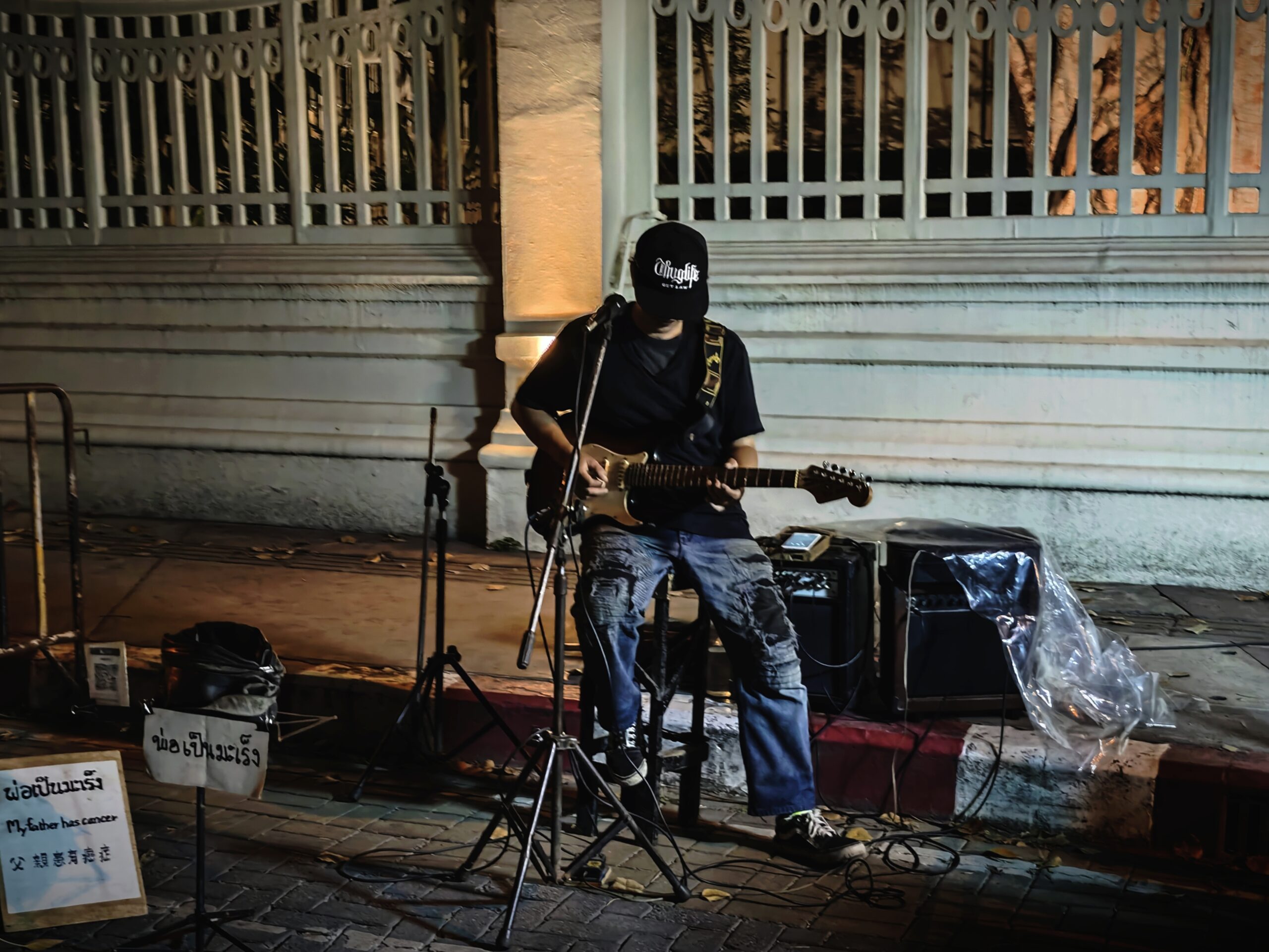 こちらは、22時に開催される路上ライブの様子。チェンマイで有名な演奏者のようで、ときどき太平門やOne Nimman、プルーンルディナイトマーケットにも出現。