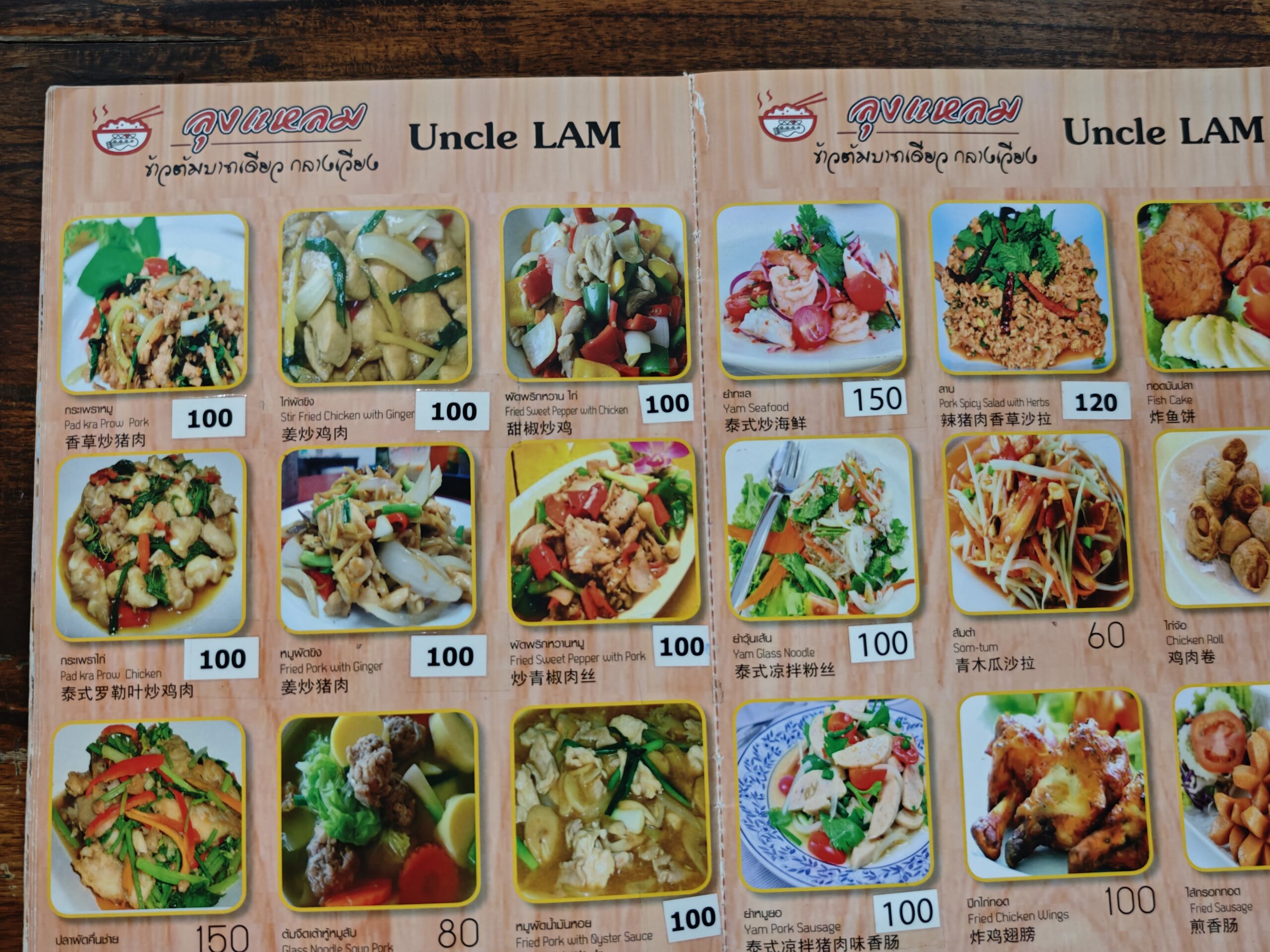 一品100B(約460円)前後。屋台は、どこもお馴染みなので、本格的なタイ料理が食べたい方は、Uncle Lamなど、メインストリートに隣接する飲食店もお勧め。