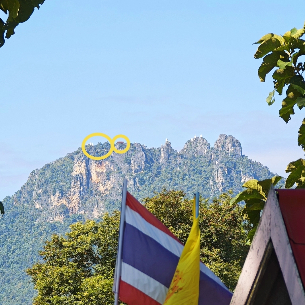 遠目で、あの切り立った崖へ行くの?と思うと少し不安でしたが、実際には右側の白いパゴダ群ではなく、黄色で囲んだ場所へ、麓に着いてからはピックアップトラックで約8分、それから階段を1,219段、約25分ほど登るとあっさり到着してしまうといった所でした。