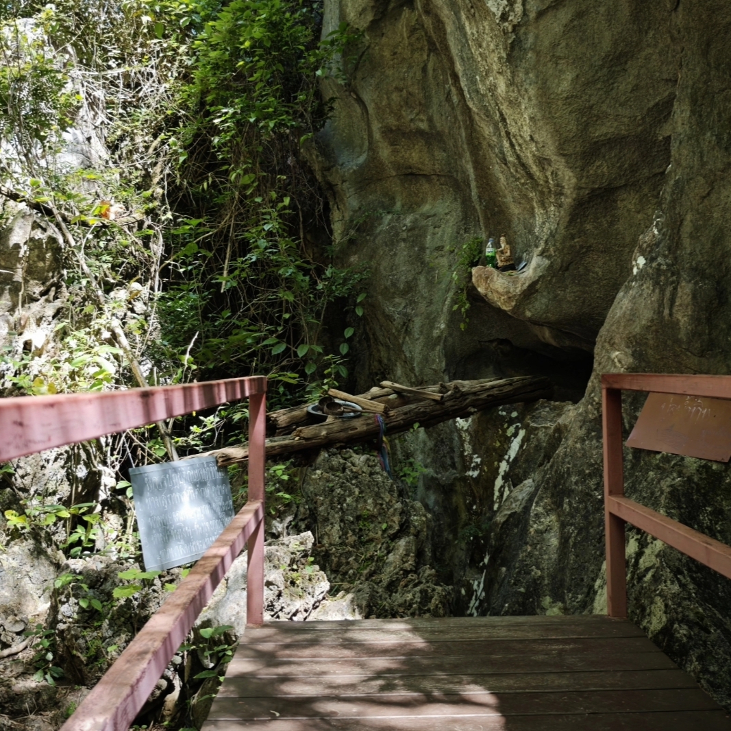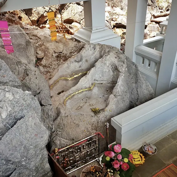 さらに、スマンカラロ洞窟から左へ廻ると、釈迦の仏足跡。仏足跡は、地元民が信仰する自然にできた岩のくぼみで「本物の釈迦の足跡」ではなく、タイではこうした自然跡を仏足跡とみなして信仰の対象とする例が多いようです。